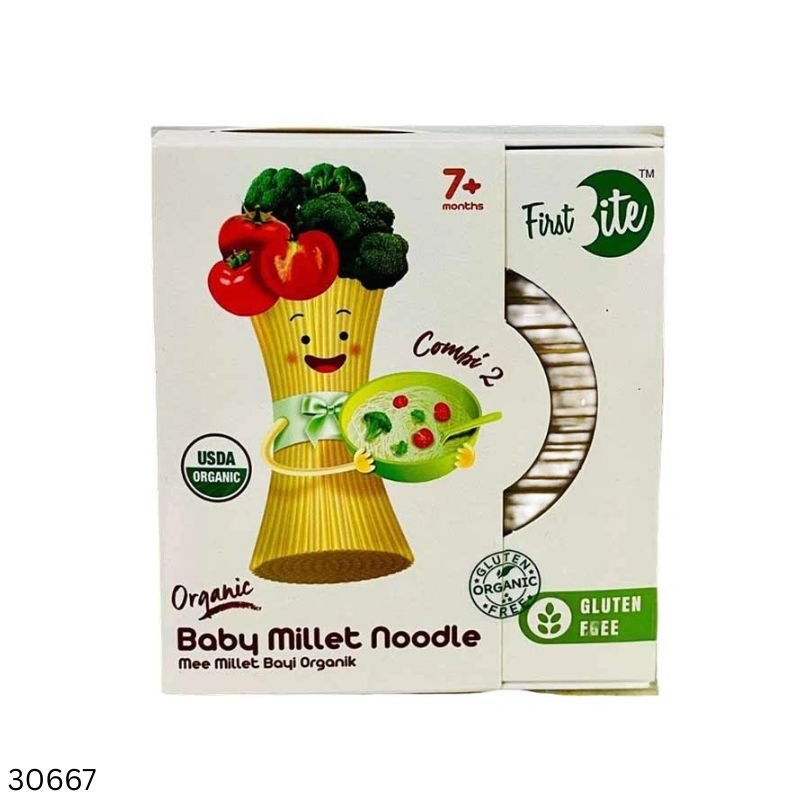 First Bite Organic Baby Millet Noodle ৭ মাস বা তার বেশি বয়সী শিশুদের জন্য বিশেষভাবে তৈরি একটি পুষ্টিকর ও নিরাপদ অর্গানিক খাবার। এই নুডলটি তৈরি করা হয়েছে অর্গানিক মিলেট (Millet) দিয়ে, যা সহজে হজম হয় এবং শিশুর স্বাভাবিক বৃদ্ধি ও বিকাশে গুরুত্বপূর্ণ ভূমিকা রাখে।