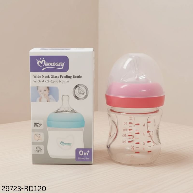 The Wide Neck Glass Feeding Bottle with Anti-Colic Nipple is designed to provide a safe, comfortable, and natural feeding experience for babies. Made from high-quality, BPA-free glass, this bottle ensures pure and hygienic feeding without absorbing odors or stains. The wide neck design makes filling and cleaning easy, saving time for busy parents.
